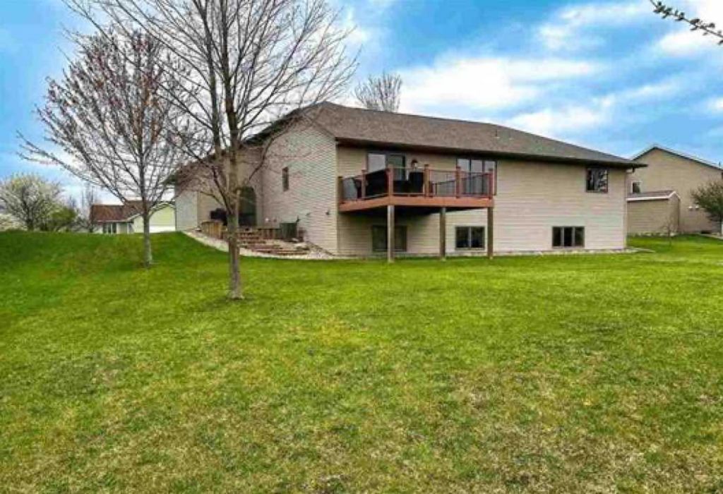 This expansive rambler in Country Club Estates offers nearly 3,300 finished square feet with 5 bedrooms, 4 bathrooms, and a generously sized insulated and heated 3-stall garage. Step inside to vaulted ceilings in the living room and a bright, open-concept layout ideal for everyday living and entertaining. Updated LVP flooring runs throughout the kitchen, dining, and living areas, while abundant natural light fills the space. You'll love the view from the patio doors that lead to a composite deck overlooking the large backyard and beautiful pond. Down the hall are three main-level bedrooms, including a spacious primary suite with a large closet and private bath. An additional full bathroom serves the remaining bedrooms. The main level also features a conveniently located laundry area just off the kitchen. Near the garage entrance, you'll find a built-in closet and an additional 1/2 bath. The lower level expands your living space with a large family room, two more bedrooms each with walk-in closets, a full bathroom, a bar area, a dedicated hobby/workshop room, and ample storage. Additional highlights include Anderson windows, in-floor heat in the lower level, a light in each shower, a tankless water heater, and an owned water softener. The exterior features durable steel siding and an almost mature apple tree. This home checks all the boxes! Schedule your showing today! Seller's agent is related to seller.